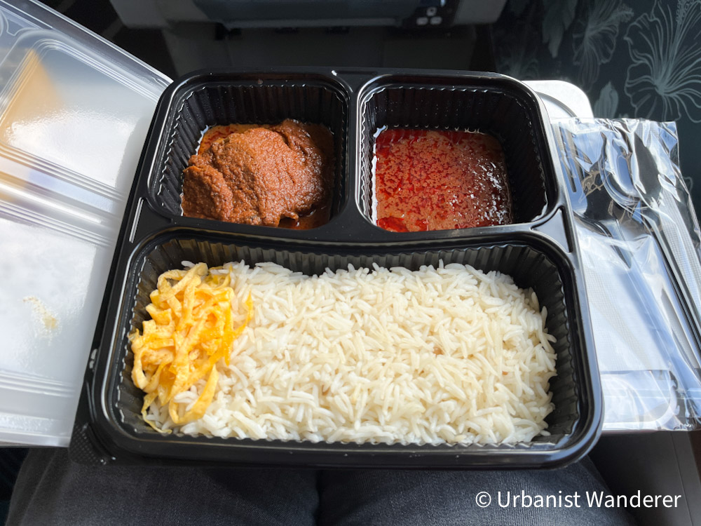 The effort must be commended, but KTMB once again struggles in the food department. The Nasi Lemak was disappointing in a few ways: It was rice-heavy with a much lighter serving of chicken and rendang, complemented by an equally light serving of the sambal tumis. Shredded omelette and anchovies with peanuts complete the presentation with the peanuts packed separately. The rice tasted alright but the chicken was rather dry, and both the rendang and sambal weren’t enough for the amount of rice provided. Oddly enough, there were no vegetables, not even cucumbers which are usually given with Nasi Lemak.