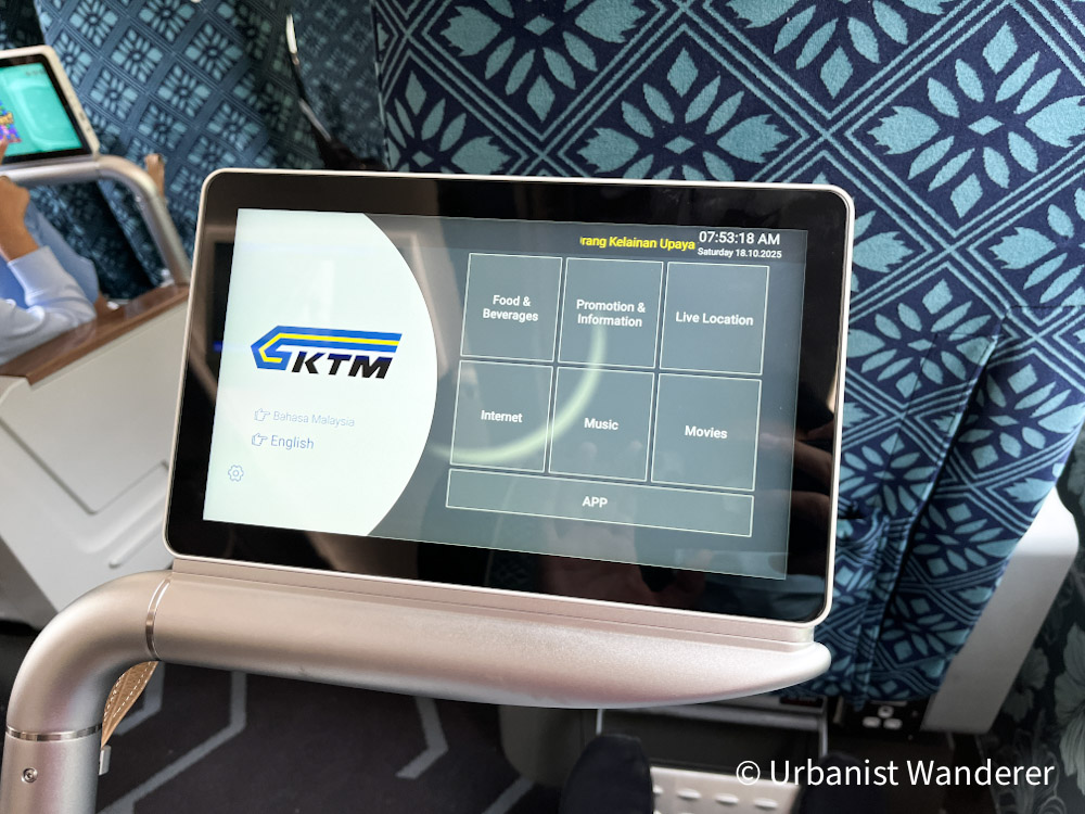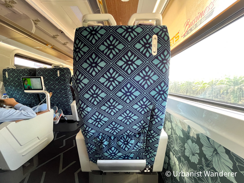 The armrests open up to reveal a foldable tray table on the right, and an entertainment screen on the left. Above the seats are overhead enclosed baggage compartments instead of the traditional open racks. A footrest is also installed, though it requires some manoeuvring to drop down; It all felt very airplane-Business Class, which KTMB is clearly trying to emulate, though I personally think the entertainment screen is overkill for a train.