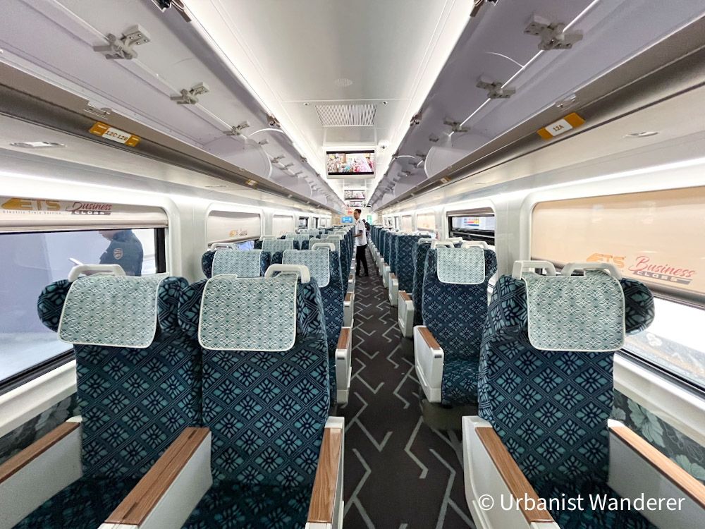 These Chinese CRRC-built Class 94 sets are equipped with a two-class configuration onboard its six coaches. Coach A hosts Business Class, and Standard Class seats fill the remaining five coaches. Despite the choice of name, the ETS Business Class is roughly equivalent to First Class on British and European trains.